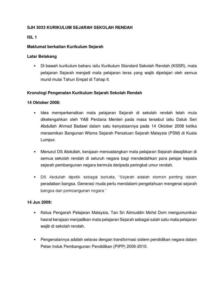 Sjh 3033 Kurikulum Sejarah Sekolah Rendah Isl 1 Maklumat Berkaitan Kurikulum Sejarah Latar Belakang