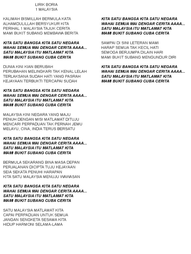 Lirik Lagu Satu Malaysia Satu Bahtera Docx